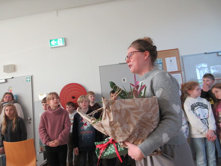 Nun hieß es Abschied nehmen von Frau Weide, unserer Reinigungskraft, die zum neuen Jahr in den Ruhestand geht. Ida und Emily eröffneten die Verabschiedung mit einer kleinen Theatereinlage. Danach sangen alle zusammen das umgedichtete Lied "Boom Zoom - tschüss, Frau Weide!". Dieses lässt sich in der neuen Schülerzeitung nachlesen/-singen. Frau Meyer-Pokorny und Herr Lohmann, der, Samtgemeindebürgermeister, bedankten sich bei Brigitte Weide für ihre engagierte, umsichtige und zuverlässige Arbeit in der Grundschule Cramme. Seit 39 Jahren ist sie an der Schule tätig gewesen- Wahnsinn! Mit anderen Worten kennt sie jeden Winkel...., aber vor allem hatte sie auch immer ein offenes Ohr für jeden und war total hilfsbereit: Eben eine gute Seele der Schule! Von allen Klassen und der Elternschaft bekam Frau Weide Geschenke zum Abschied. Sie selbst verteilte tags drauf auch welche an die Kinder - typisch Frau Weide eben... In der Schülerzeitung gibt's auch ein Interview mit ihr. Alles Gute wünschen wir ihr für den Ruhestand!